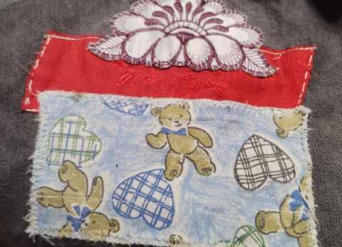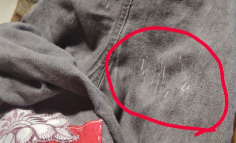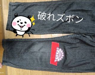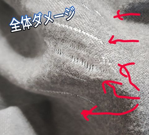 上の状態でしばらく履いていてさらに破れて 上からさらにまた布を当てて履いていました↓