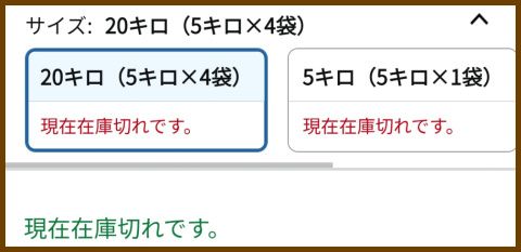 ↑少し前にアマゾンさんで備蓄米を検索したときは出てこなくて 偶然購入できた時に20キロ残20個 10キロ残表示なし(よゆうあり)の表示でしたが 購入後2時間後に見たときは全部「売り切れ」でした