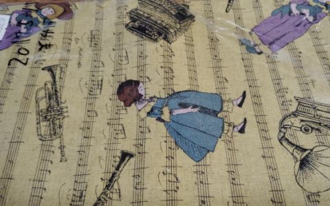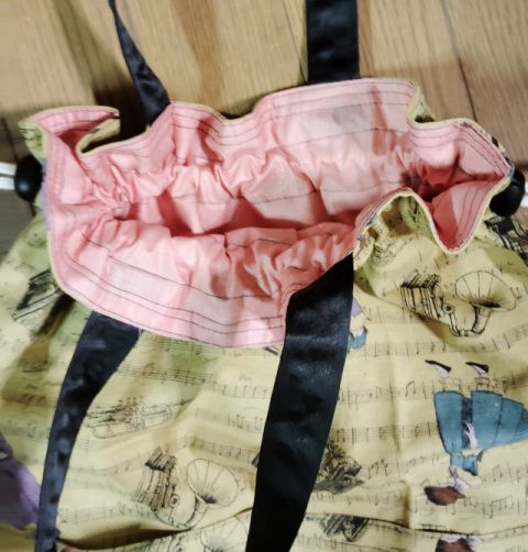 裏布はオレンジ系の布、内側にもポケットをつけています